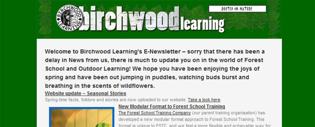 ![May Newsletter Welcome to Birchwood Learning’s E-Newsletter – sorry that there has been a delay in News from us, there is much to update you on in the world of Forest School and Outdoor Learning! We hope you have been enjoying the joys of spring and have been out jumping in puddles, watching buds burst and breathing [...]](http://www.birchwoodlearning.com/wp-content/uploads/2012/05/newsletter_may12.jpg)